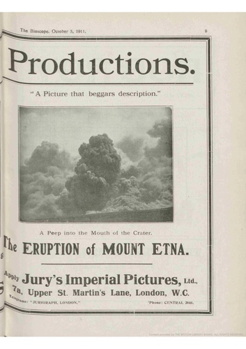 La notizia del filmato, come segnalato dal British Film Institute, è riportata in «The Bioscope» (v. 13, n. 260, 5 Oct 1911, p. 9). Nel suo libro teorico illustrato "Moving Pictures. How they are made and worked" (1912), pubblicato dalla J.B. Lippincott Company presso Philadephia (pp. 314-315, fonte completa al link), il fotografo Henry Fox Talbot riporta alcuni frame e commenta le immagini della Jury's Imperial Pictures che probabilmente si riferiscono proprio al filmato del 1911 (dato da verificare). La didascalia, "MOUNT ETNA IN ERUPTION", sembra più un commento alla foto che il titolo dell'opera, anche se non è da escludere che ci siano stati più filmati in circolazione della stessa compagnia. Le immagini che accompagnano il testo riprendono un'esplosione del vulcano e la minaccia delle emissioni sullo sfondo di un osservatorio. Si tratta dell’osservatorio “Vincenzo Bellini” che secondo l'INAF fu «completato nel 1880, in prossimità del cratere centrale, sul versante Sud, a quota 2940 m. Qui si trovava un rifugio per viaggiatori, noto come la “Casina degli Inglesi”, che fu anche il primo osservatorio vulcanologico a quote elevate mai realizzato. Questa struttura derivò dall’ampliamento nel 1811 del rifugio Gratissima, costruito dai fratelli Mario e Carlo Gemmellaro nel 1804, alle spese del quale avevano partecipato i militari della flotta inglese di stanza a Catania e presso cui Carlo Gemmellaro prestava servizio come medico» (