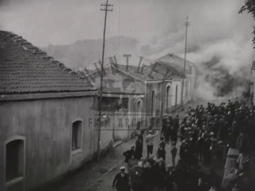 Il filmato mostra l'avanzare lento della colata lavica nel paesaggio, fra le case e le strade del paese. Gli abitanti osservano la discesa o si arrampicano su dei pali per osservare l'area dall'alto. Si svuotano le case e si caricano i beni sui tradizionali carretti mentre qualcuno smonta anche le porte. Vicino al fronte della lava, sorvegliato da soldati e carabinieri, alcuni di questi siedono in attesa su un muretto. In dettaglio lo sgretolamento della colata mentre si raffredda, gli alberi che bruciano e la corsa per salvare le proprie cose mentre grandi case vengono giù o sono circondate dal fronte lavico. Un santo viene portato in processione davanti a una chiesa. Una folla di persone corre e scappa per allontanarsi alla caduta di un enorme caseggiato.