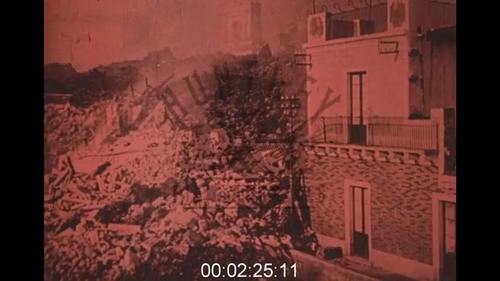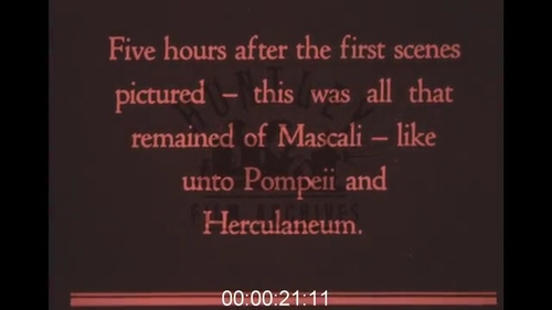 Il filmato riprende molte delle immagini contenute in "1928 - Mount Etna erupts and destroys the town of Mascali in Sicily, Italy (ref. n. 1000702)" anche se virato in rosso. Mostra sempre il paesaggio, la distruzione delle case, le azioni degli abitanti (che salgono sui pali a controllare, portano via le cose e stanno a ridosso del fronte lavico anche quando questo fa crollare delle case e li costringe a fuggire). Probabilmente la durata dell'originale era più lunga. Si vede qui al link solo una versione ridotta. A differenza del precedente però aggiunge delle didascalie che fanno leva su una comunicazione catastrofica improntanta al sensazionalismo, alla paura e alla storicizzazione. Il paese, per esempio, "annidato sul pendio del vulcano addormentato, vede il terrore risvegliarsi e la rovina scendere strisciando". La colata lavica viene nominata come un «inesorabile, inarrestabile flusso di disastro». Tutte le speranze sono abbandonate e in cinque ore Mascali è paragonata a Pompei ed Ercolano. Fonte completa e video al link. Per una descrizione del fenomeno a altri documenti correlati si veda la raccolta "Etna 1928" o gli esempi a seguire....