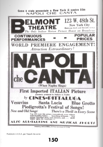 «l'incantevole città che si profila alle falde del Vesuvio fumante, una presentazione di tipici caratteri napoletani, presi nella loro vita normale quotidiana, fatta di spensieratezza e di lacrime, di sentimentalismo e di canzoni [...] accompagnato da una da una troupe di cantanti napoletani i quali mentre la pellicola si svolge cantano con il fascino della loro malinconia, tutte le più belle e squisite melodie napoletane». Secondo un'altra recensione la musica accompagna la canzone napoletana mentre «sullo schermo, il panorama di Napoli si distende sotto gli occhi, mentre il Vesuvio innalza il suo bianco pennacchio verso il cielo». L'opera, probabilmente accompagnata da un suono registrato esternamente o musicato dal vivo, avrebbe riscosso successo presso il pubblico. Come dimostra una pubblicità estera riprodotta nel libro, il film fu diffuso all'estero. Fonte completa al link....
