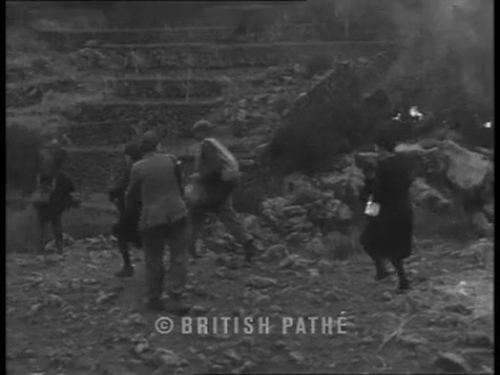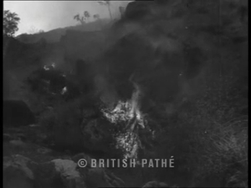 Nella parte iniziale si vede il fronte della colata lavica che si raffredda, con la caduta di alcuni agglomerati e l'incendio della vegetazione. Alcuni abitanti sono ripresi mentre fuggono dalla loro abitazione povera. Segue una visione dall'alto di un casolare, con delle persone a ridosso dell'eruzione. Un prete viene inquadrato a mezzo busto in un atto di preghiera. Fonte completa al link. Per una descrizione generale dell'eruzione e i documenti connessi si veda la raccolta "Etna 1947", a partire dai suggerimenti di questa scheda....