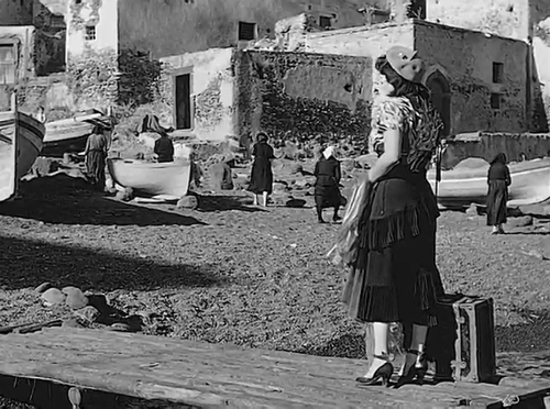 Le iniziali riprese panoramiche, con la voce fuori campo che ricorda come siano «ossa di fuoco impastate di cenere». All'arrivo, con una apparizione ritardata che esalta la funzione divistica dell'attrice, appare subito evidente, la prosecuzione del legame tra le vicende della personaggia e l'ambiente vulcanico. Il percorso, che la porta vestita in maniera sfarzosa dalla spiaggia di cenere alla propria casa natia, e il contrasto con le donne vestite in abiti neri del luogo rivelano, anche attraverso il suolo accidentato e le cicatrici di vecchie eruzioni che rimangono ancora dopo molto tempo sui muri delle case, la realtà sociale dura, dominata storicamente dal vulcano nell'area.