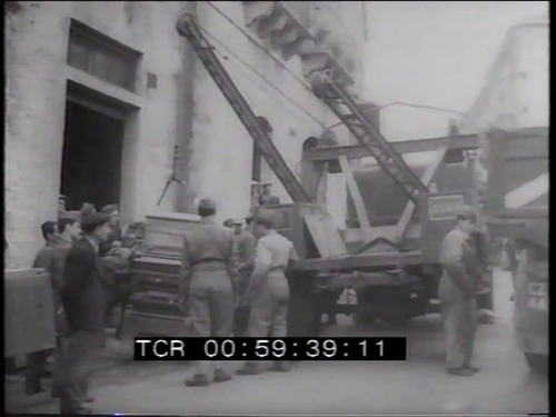 Un uomo della polizia stradale dirige con una paletta il traffico di automezzi per le strade tortuose. Mentre gli uomini caricano masserizie su camion, il vento agita gli alberi e altri portano ceste sulle spalle. Gli automezzi militari pieni sostano fermi in un paese (non ben identificato). Altri due uomini a piedi guidano un carretto trainato da mulo carico di masserizie.