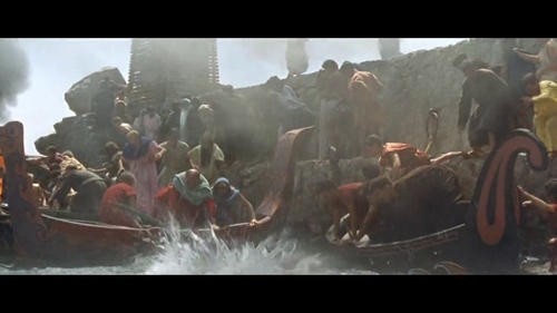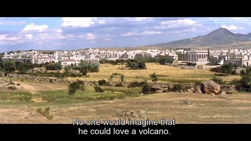 Di rientro dalla Palestina, Glauco insieme ai suoi centurioni cavalca in vista di Pompei e del Vesuvio. I personaggi si soffermano un attimo ad ammirare la vista sottolineando come «nessuno può immaginare che qualcuno possa amare un vulcano». Durante la battaglia, spesso, sottolinea qualcuno di loro, c'è stato il timore di non rivederlo più e il vulcano appare ai loro occhi stupefacente come non mai. Il paesaggio del Vesuvio con Pompei in primo piano è ricreato con effetti speciali, probabilmente uno scenario in miniatura e uno screen o con una tecnica di glass o matt painting.