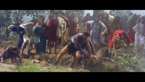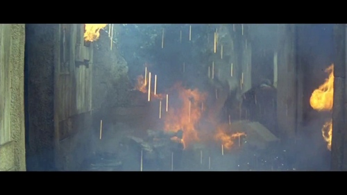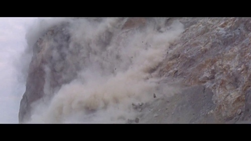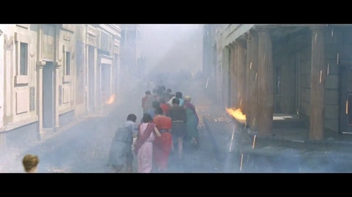 La scena della catastrofe si avvale dell'uso di un modellino e di esplosioni per mezzo di effetti pirotecnici sia di tipo ascendente che discendente. La sequenza appare più lunga degli altri film, arricchita da dettagli sulla distruzione dell'arena, numerosi crolli, la simulazione della colonna eruttiva e la successiva caduta dei lapilli pirotecnici e della colata piroclastica sulla città e a valle. Sono sviluppate molte scene di primo piano su personaggi secondari e le loro storie, con un particolare accento sui bambini.