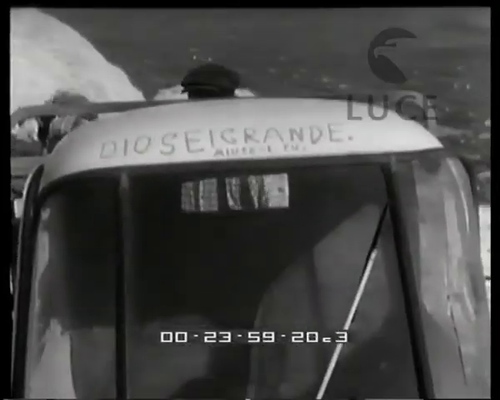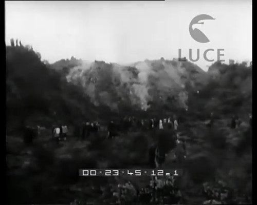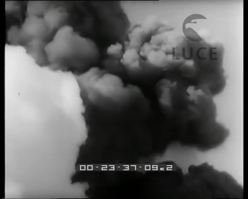 Il brevissimo filmato cinegiornalistico in bianco e nero è datato 22 luglio 1960 per cui si tratta di riprese legate all'attività esplosiva del Cratere Centrale fra il 17 e il 20 luglio. Non si parla di colate laviche per cui le riprese corrispondenti nel filmato potrebbero essere riferite ad altre eruzioni. I dati e le ipotesi sono quindi da rivedere. Ad ogni modo, sul piano filmico, il documento si apre con un tappeto enfatico musicale e di rumori. Esso racconta, per mezzo di una voce fuori campo, l'esplosione dell'Etna come «uno spettacoloso fungo simile a quello di una esplosione atomica». La metafora ricorre altre volte fra gli anni Cinquanta e Sessanta anche nell'area vesuviana ed eoliana. La sequenza successiva comprende delle immagini della colata sulle pendici del monte e l'avanzare del fronte lavico, altissimo rispetto alle persone che lo osservano a ridosso. Le riprese in dettaglio della caduta di agglomerati dalla colata in via di raffreddamento, ancora non pienamente solidificati, vengono potenziati dal commento che nota come «massi grandi come autobus sono stati scagliati verso il cielo dalla titanica forza della natura rotolando a valle fra i terreni coltivati». Il montaggio muove le immagini sulla cima innevata del vulcano. Su un camioncino si legge la scritta: «Dio sei grande | Aiutaci tu». Le scene successive riprendono tramite un camera car la strada e la sciara nella parte sommitale. Qui la voice over precisa enfaticamente che «il fenomeno dell'Etna è incontrollabile. I vulcani – personalizzandoli – posseggono un carattere perverso. La loro pazzia è improvvisa. E sempre sul fronte dell'eruzione la pioggia lavica e i lapilli incandescenti devastano i vigneti e gli oliveti». Molti frammenti qui mostrano gli effetti della loro caduta: con il dettaglio di una mano per misurarne dimensioni e peso, una signora che spazza con una scopa di saggina una strada e altri abitanti uomini che creano cumuli con delle pale ai margini di una via in un paese. «L'Etna – conclude il commentatore – brontola quando meno te lo aspetti. Lapilli e ceneri coprono di una coltre nera città e campagne. Ma fino a quando dura così, i Siciliani spalano e ringraziano il Signore». Il filmato si chiude con una panoramica in campo lunghissimo per mostrare il cielo cupo che sovrasta il territorio. Fonte completa al link. Per una descrizione dei fenomeni dell'anno e altri documenti si veda la raccolta "Etna 1960", a partire dagli esempi di seguito....