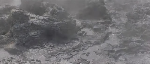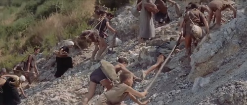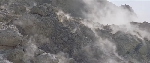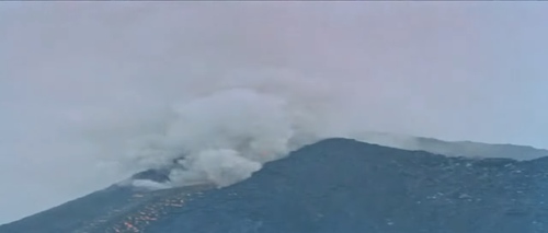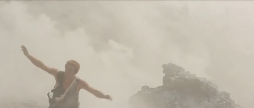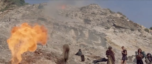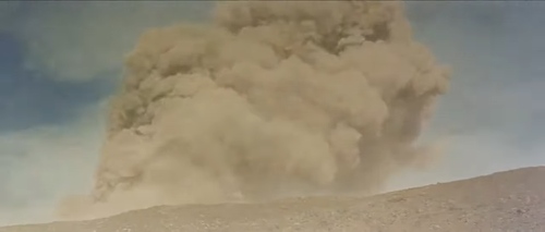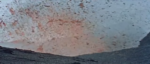 La scena catastrofica (m. 83 ca.) parte dalla scalata del gruppo su un vulcano, non ben identificato, che esplode. L'eruzione è anticipata dalle emissioni del suolo attraversato dalla folla, dal bollore del fango e dalla reazione dei protagonisti in primo piano verso l'area sommitale. Sono utilizzate immagini di repertorio dell'eruzione, non ben denotato, e di cadute di massi che si alternano ai primi piani dei protagonisti e poi alla fuga dell'intero gruppo sotto la cenere e i lapilli. Nel film, per la prima volta in Italia forse, si mostra in continuità una frattura e successiva caduta dei personaggi al suo interno (sebbene con riprese in esterni). Allo stesso modo si insiste sugli effetti della caduta di materiale piroclastico consistente su singoli corpi.