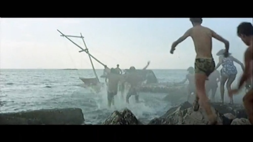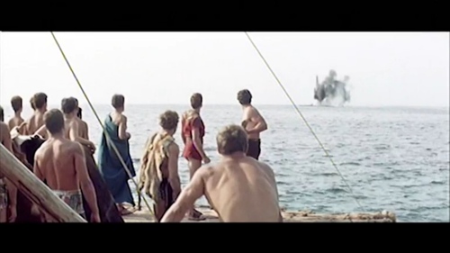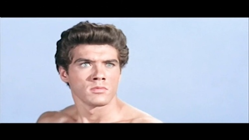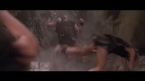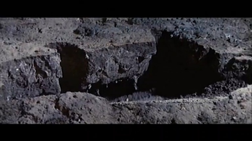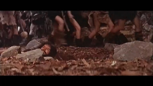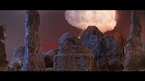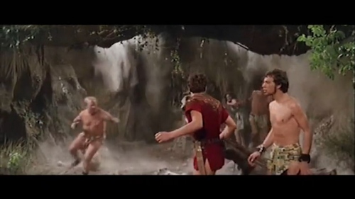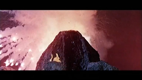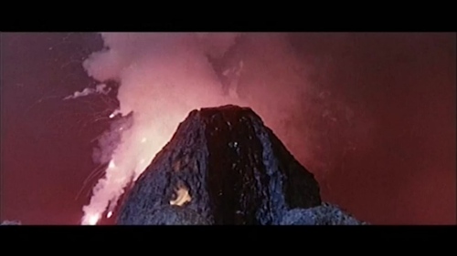 Nel film di finzione a colori, dopo una terribile eruzione vulcanica, Maciste guida i pochi sopravvissuti al disastro verso la terra di Urias. Qui, l'eroe va in soccorso di Amoha, regina locale in fuga dai tagliatori di teste. La lunga scena della catastrofe dell'opera si inserisce prima dei credits iniziali come prologo e scena fondamentale di innesco dell'azione. L'opera si apre con l'eruzione del vulcano ricreato attraverso un modellino e un set miniaturizzato di contorno con un fondale illuminato per ricreare l'effetto notturno e infuocato dell'aria. Ne deriva per gli abitanti che vivono nelle grotte, che sembrano quasi dei primitivi, il crollo delle stesse per i parossismi. Molti restano seppelliti. Si aprono delle spaccature dentro e fuori dalla grotta, in cui cadono alcuni. Una volta all'esterno, il terreno continua ad aprirsi sotto i loro piedi. Il vulcano prosegue le sue esplosioni (con un incremento di fuochi ed effetti piroclastici) ma con un errore di continuità tra la luminosità delle riprese esterne e il cielo completamente oscurato dell'edificio vulcanico. Guidati da Maciste, il gruppo si salverà correndo verso il mare. Il contrasto fra la scena diurna e il vulcano quasi al buio continua in altre inquadrature. Si accentua, alla fine, il primo piano dei protagonisti salvi dal mare mentre osservano l'esplosione dell'intera isola vulcanica....