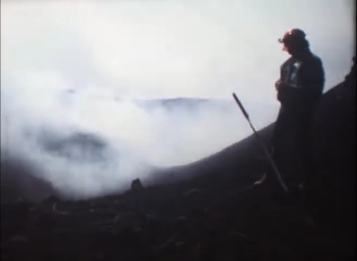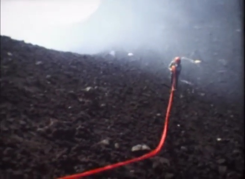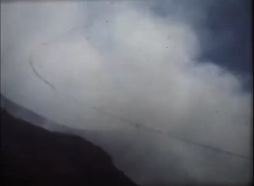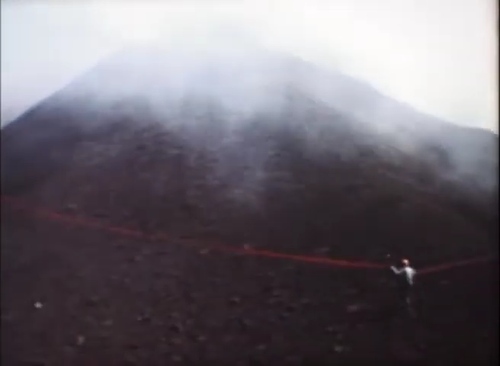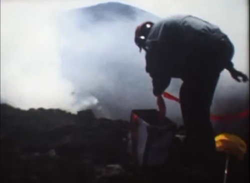 Nel filmato lo vediamo installare dei lanciarazzi pirotecnici legati a delle lunghe strisce di nastro rosso. Con gli stessi tenta di superare il cratere o perimetrarlo. Le bande lanciate in mezzo alle emissioni simulano un principio di eruzione.