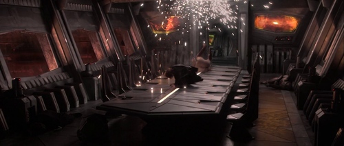 Prima del duello, Anakin indebolisce e ferisce il personaggio femminile. La battaglia dall'esterno si sposta all'interno, in cui viene danneggiato uno strumento di gestione degli impianti meccanici.