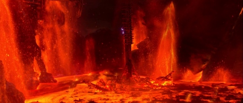 Una parte della stazione si sgancia e la lotta si sposta sul fiume di lava, in cui i due personaggi riescono a galleggiare su dei frammenti.