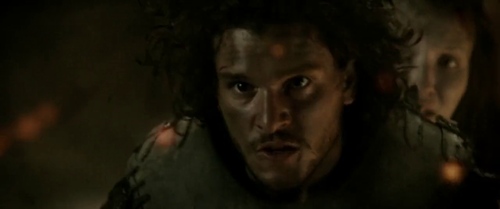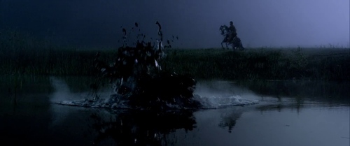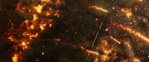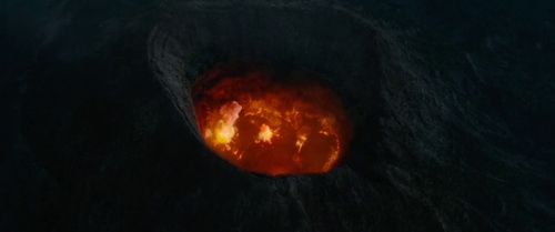 Nella seconda parte del film, giorni dopo i primi presagi, durante un duello nell'arena che coinvolge il protagonista, si manifesta un terremoto che segna l'inizio dell'attività del vulcano (come da topos narrativo di lunga durata). L'esplosione del vulcano è resa evidente poi dalla ricostruzione della colonna eruttiva in CGI. Questa è ripresa da una panoramica in campo lunghissimo dall'arena, che nel frattempo inizia a crollare, e da una visione zenitale soggettiva dall'alto del vulcano, che investe gli spettatori. Quest'ultima prospettiva è inedita nella filmografia. Il terreno dell'arena si spacca tramite effetti speciali e il protagonista viene inghiottito al di sotto (salvandosi).