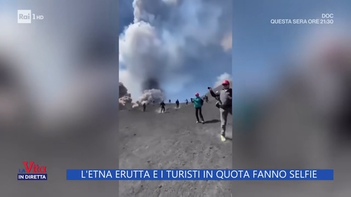 Il crollo di una parte del cratere dell'Etna ha spaventato molti turisti che si trovavano in quota per un'escursione. Colti di sorpresa, hanno però ripreso subito l'evento naturale che poteva avere secondo gli esperti anche conseguenze più pericolose. Durante una puntata de "La vita in diretta" si mostrano i video prodotti e girati dai turisti, circolati sul web e acquisiti dall'emittente. Nel servizio si intervistano le persone che hanno visto la nube eruttiva paragonandola all'eruzione di Pompei del 79 d.C.. Dopo la sua messa in onda, si discute in studio con gli ospiti presenti sulla pratica del selfie e le questioni di sicurezza. Uno dei filmati usati è stato oggetto sul web di dubbi se fosse stato generato dall'Intelligenza artificiale e sottoposto a fact cheking da Euro news. Si veda per questo il documento intitolato "Fact check: Tourist videos of Mount Etna are real, not AI-generated". Sul tema dei selfie sull'Etna si veda anche "Etna, assalto per i selfie tra neve e lava: è polemica"....