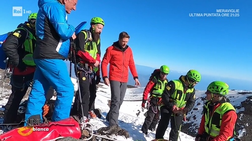 Puntata di "Linea Bianca" con Massimo Ossini che racconta l'Etna a partire dalle nere colate laviche che stanno sotto il manto nevoso a quota 2.900 metri sul livello del mare sulle pendici del cratere Barbagallo, circondati dal mare sullo sfondo (topoi ricorrenti). Il programma è dedicato all'esplorazione del tema delle montagne, che sull'Etna trova uno sviluppo specifico per la sua natura vulcanica. Si parte da quote più basse con un "Donkey Trekking", un'esplorazione ecosostenibile in sella a un mulo. Nei documenti storici del passato è testimoniato invece il suo uso come unico mezzo per salire nelle aree sommitali in assenza di strade e mezzi di altri tipo, per il trasporto della vegetazione sottratta alla lava da parte dei carbonai e per lo sgombero delle case minacciate dalle eruzioni. In una parte della produzione, si incontrano le guide alpine sul territorio. In sorvolo con l'elicottero, invece, con il vulcanologo Boris Behncke dell'INGV si conoscono le attività di studio e monitoraggio dell'Etna. Alcune immagini testimoniano la tratta della Ferrovia della Circumetnea, una linea ferroviaria dismessa nel 2024 di circa 110 chilometri intorno al vulcano da Catania a Randazzo e da Randazzo a Giarre-Riposto, inaugurata nel 1898. Si trattava di un mezzo di trasporto a uso anche turistico che consentiva di osservare il vulcano, gli abitati e gli effetti delle colate nell'ambiente da scorci peculiari. In un laboratorio di Misterbianco si lavora la pietra lavica. Si esplorano alla fine nella parte Nord del vulcano, la cavità dei Ladroni e la genesi e le caratteristiche delle oltre duecento grotte dell'Etna....