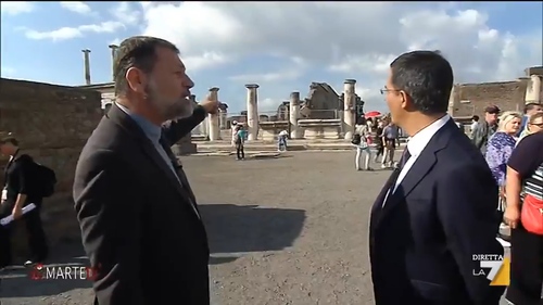 Giovanni Floris e Massimo Osanna, soprintendente all'area archeologica di Pompei, Stabia ed Ercolano esplorano nello speciale all'interno del programma "Di martedì" il sito di Pompei per raccontare la catastrofe e gli scavi archeologici.
