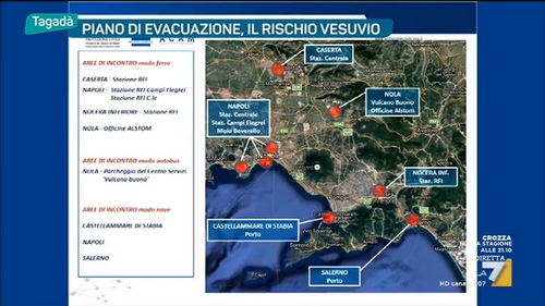 Servizio giornalistico che presenta il Piano di Evacuazione proposto dal governatore della regione De Luca. Nell'approfondimento si mettono in evidenza le carenze infrastrutturali soprattutto delle strade viarie e la sostenibilità del sistema ideato. Il piano è confrontato con i parerii della comunità scientifica. In merito, per un confronto con i piani elaborati fino al 2026 si ricorda che è disponibile online il "Piano nazionale di protezione civile per il rischio vulcanico" del Dipartimento della Protezione Civile....