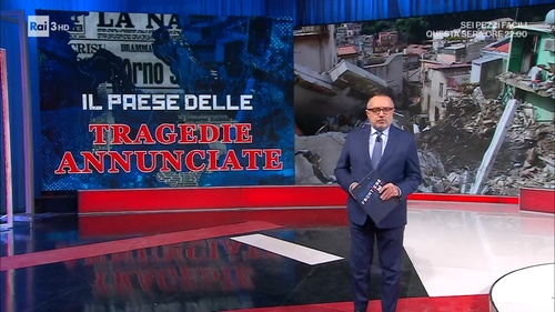Il programma "Frontiere" dedica una puntata tematica a "Il Paese delle tragedie annunciate". L'Italia viene definita come un: «Un Paese generoso nell'emergenza quanto distratto sui temi della prevenzione e della manutenzione.e degli impegni per evitare altri eventi catastrofici». Lo spunto di partenza deriva dalla frana avvenuta a Ischia il 26 novembre 2022, causata apparentemente come si disse allora da un'improvvisa 'bomba d'acqua'. Ma fenomeni simili, come emerge nel documento, erano già accaduti nel 1910. A 112 anni di distanza, si evidenzia, nulla sembra cambiato. Ne derivano dei quesiti: «perché ancora oggi si muore di pioggia?». Nella puntata sono ricordate le catastrofi dovute a frane o alluvioni: Roma, negli anni dopo le bonifiche del fascismo; nel Polesine negli anni Cinquanta; a Genova più volte colpita; nel Vajont nel 1968. E, più a Sud: Sarno nel 1998 e Giampillieri nel 2009. A immagini d'archivio e testimonianze si succedono in studio Renzo Rosso (ingegnere ambientale), Gian Antonio Stella (Corriere della Sera), Telmo Pievani (filosofo delle scienze biologiche), Erasmo D'Angelis (giornalista) e Grazia Francescato (ambientalista). Dalla trasmissione emerge come frane e alluvioni in Italia non sono solo eventi naturali, ma il risultato soprattutto di un grave dissesto idrogeologico causato anche da fattori umani (urbanizzazione selvaggia, cementificazione, deforestazione, scarsa manutenzione), rendendo il 90% dei comuni italiani a rischio, con migliaia di vittime e danni ingenti nel tempo, evidenziando una fragilità territoriale e una mancata prevenzione nonostante gli avvertimenti. Sono questi aspetti a fare dell'Italia il Paese che trasformerebbe i disastri in 'tragedie annunciate'. Video e fonte al link. Su Sarno e Giampillieri si vedano le raccolte e i documenti connessi, a partire dagli esempi di seguito....
