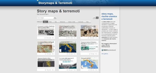 Le story maps sono una combinazione di mappe interattive e applicazioni create da INGV che incorporano contenuti multimediali e funzioni di interazione. Le pagine web con contenuti multimediali (con un livello tecnologico legato agli anni di produzione intorno al 2015) sconsentono di esplorare contenuti per l'informazione, la didattica e la comunicazione di fenomeni naturali come la sismicità del territorio e le modalità di riduzione del rischio sismico....