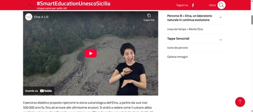 "#SmartEducationUnescoSicilia" è un progetto di storytelling interattivo dedicato anche al "Monte Etna" per valorizzazione il vulcano come luogo entrato a far parte nel 2018 del Patrimonio Mondiale dell'Umanità nella lista dei siti UNESCO. Esso è costruito tramite testi, video, immagini per approndire la natura dell'edificio vulcanico, l'evoluzione, la storia delle principali eruzioni e stimolare attività laboratoriali fondate soprattutto sui cinque sensi con attenzione all'accessibilità e inclusività grazie a contenuti adattati a persone con disabilità e vari livelli di conoscenze....